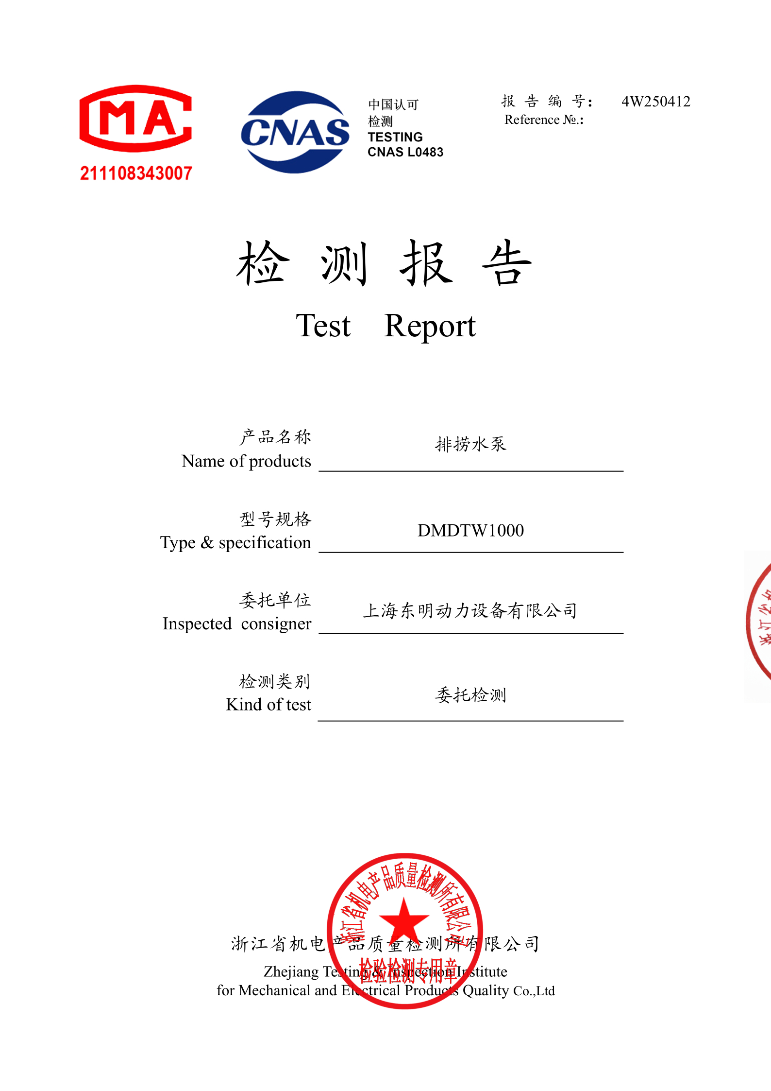 品質是設備長期穩定運行的基礎,DMDTW1000 通過專業機構全維度檢測認證,涵蓋流量揚程、動力性能、結構強度、電氣安全等核心指標,各項參數均符合行業規范。