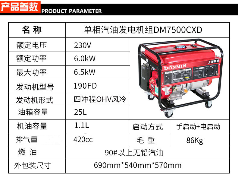 * 表示必填采購:單相6千瓦汽油發電機組電啟動DM7500CXD【帶移動輪】